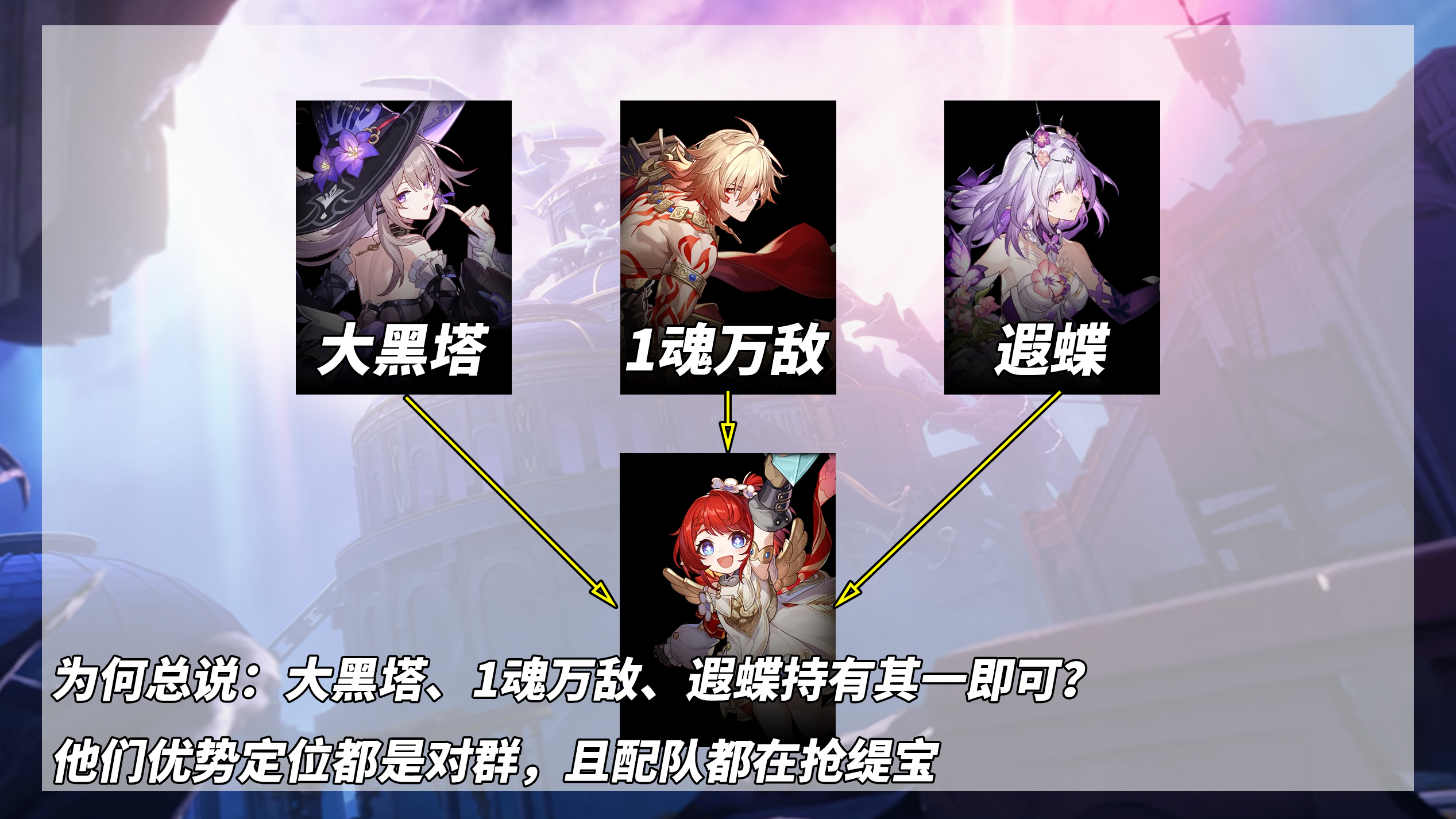 环境角度,大黑塔、1魂万敌、遐蝶,持有其一即可;