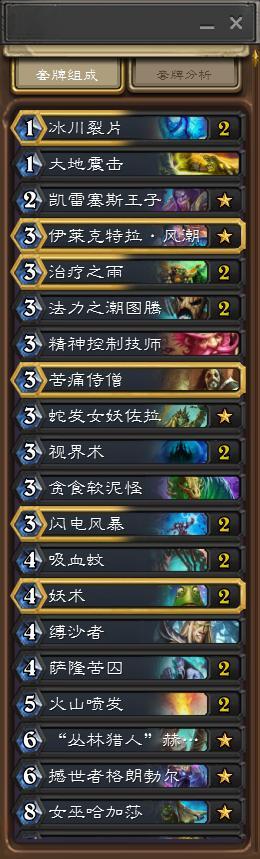 这套战吼萨跟之前的卡组比起来,带了一张大地震击来应对天梯上数量不少的猎人,同时由于这波补丁的原因,减少了一张TC130来提供卡位。