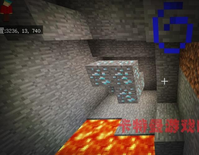 在坐标位置为:2432、16、868的位置,我们就来到了另外一个大峡谷,在这里发现了丰富的钻石资源,一共是8块,这下钻石也有了。