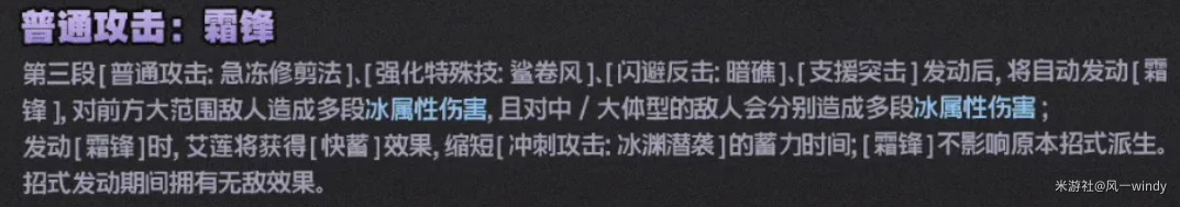 而在艾莲增强过后,施放普攻第三段、强化特殊技第二段、闪避反击和支援突击后,艾莲均可以自动施放[霜锋],造成AOE效果。