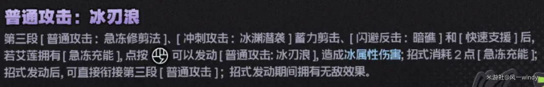 对艾莲连招影响最大的普攻新招式,在施放冲刺攻击蓄力剪后、普攻第三段后、闪避反击和快速支援后即可施放[冰刃浪]。
