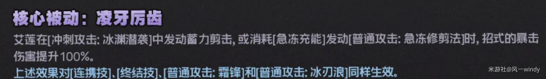 最后是艾莲在数值方面的提升,此前艾莲的核心被动只能为蓄力剪击和冰附魔普攻施加100%暴伤加成,而在增强过后,艾莲的核心被动还能对连携技、终结技以及普攻的[霜锋]和[冰刃浪]生效,大幅提高了核心被动的覆盖率,强化明显。