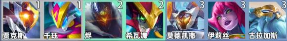 3:雷克斯、千珏、烬、希瓦娜、莫德凯撒、伊莉丝、古拉加斯。:雷克斯、千珏、烬、希瓦娜、莫德凯撒、伊莉丝、古拉加斯。