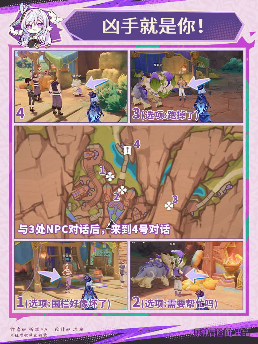 就在最近原神终于上线了5.5版本给我们带来火之国的新冒险,这次版本更新还上线了许多新内容,有新角色,新地图,新成就,那么有小伙伴好奇凶手就是你成就怎么做,下面就来告诉大家。 原神凶手就是你成就攻略 与3处NPC对话后,来到4号对话 本文内容来源于互联网,如有侵权请联系删除。