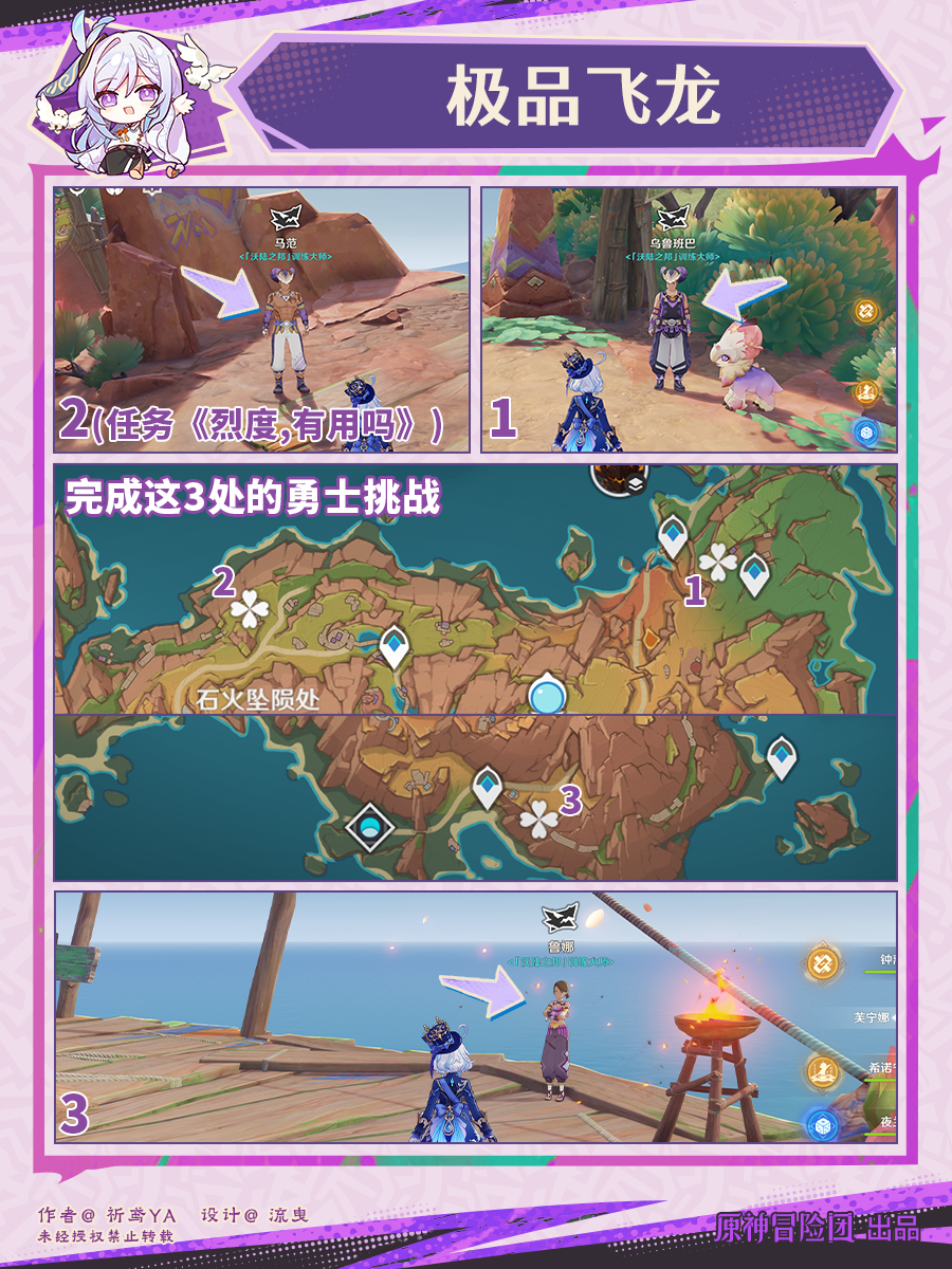 就在最近原神终于上线了5.5版本给我们带来火之国的新冒险,这次版本更新还上线了许多新内容,有新角色,新地图,新成就,那么有小伙伴好奇极品飞龙成就怎么做,下面就来告诉大家。 原神极品飞龙成就攻略 完成这3处的勇士挑战,要求都ss,就能获得成就。 本文内容来源于互联网,如有侵权请联系删除。