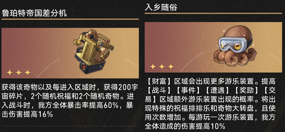【入乡随俗】可以提供大量降价游乐装置,让你以相当低的宇宙碎片消耗获取大量奇物和祝福,而且拿到三星奇物的概率相当可观——实际上,【入乡随俗】在前中期提供三星奇物的速度会比【差分机】更快,因为【差分机】一般要到后期差不多把一二星奇物都发完了才会开始大量提供三星奇物。