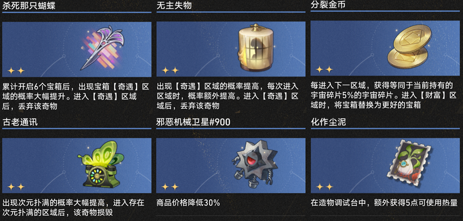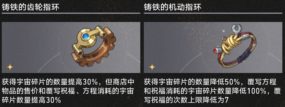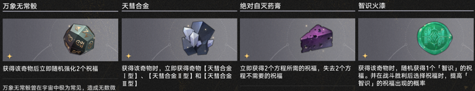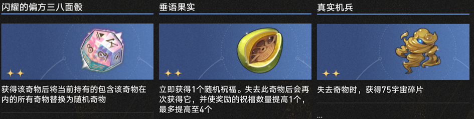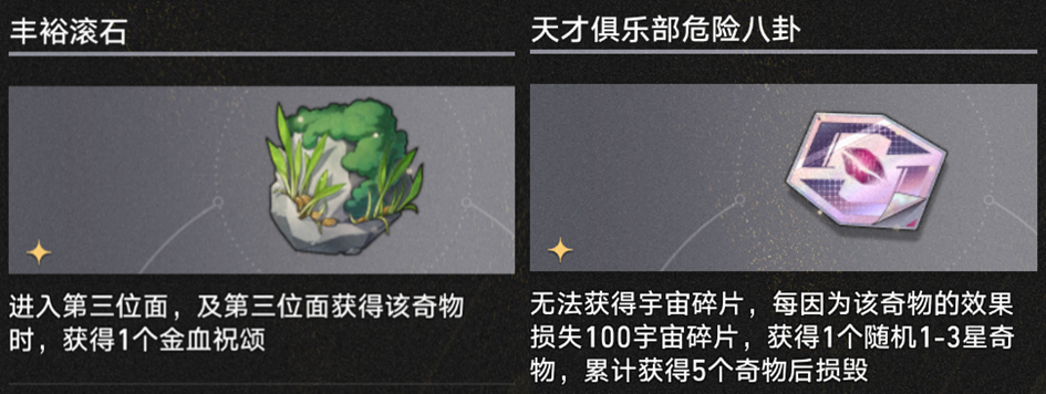 “获得奇物时获取什么什么东西”的奇物在差分宇宙基本是一次性买卖,就是单纯理财/买祝福、方程或者随机加权奇物了,拿到之后只有当合成素材或者【偏光八面骰】原料的份。