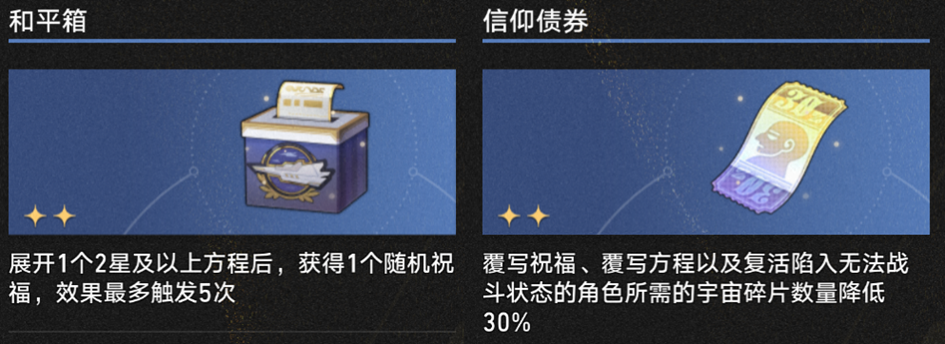 【和平箱】和【信仰债券】的效果就比较有限了——【和平箱】现在提供不了几个祝福,而【信仰债券】在商店里直接开卖方程之后的效果也相当有限了。