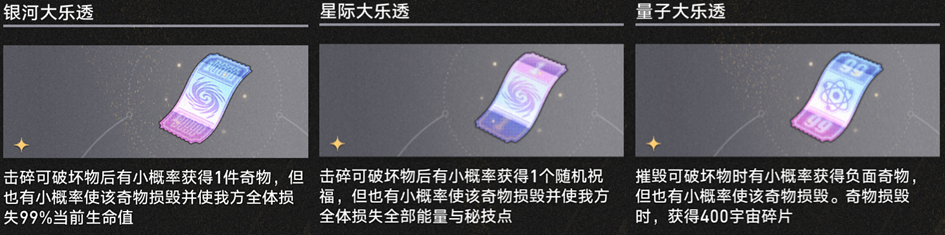 【有形幸运】则一般和【机运长袍】或者【入乡随俗】配合使用——【有形幸运】提供的宇宙碎片可以有效供应【机运长袍】或转盘游戏机的宇宙碎片消耗。