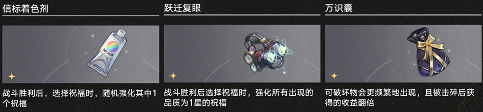 从1.0版本开服的【模拟宇宙】就开始陪伴我们的【福灵胶】可以将你下一次打怪获取的祝福升级为三星,就是不要在首领层前拿;