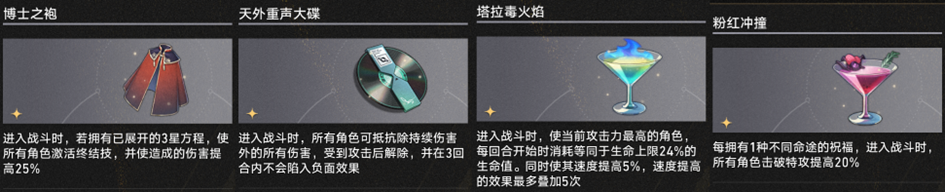 【博士袍】【碟片】和绿鸡尾酒可以提供比较通用但数额比较少的局内加成,而【粉红冲撞】则可以提供最高180%击破特攻——超击破流前期还是需要这些击破特攻属性的。