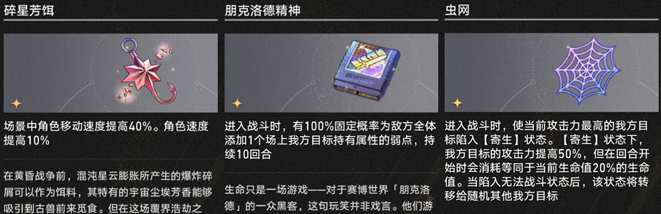 【碎星芳饵】【朋克洛德精神】和【虫网】的战斗效果也还说得过去,也能用。