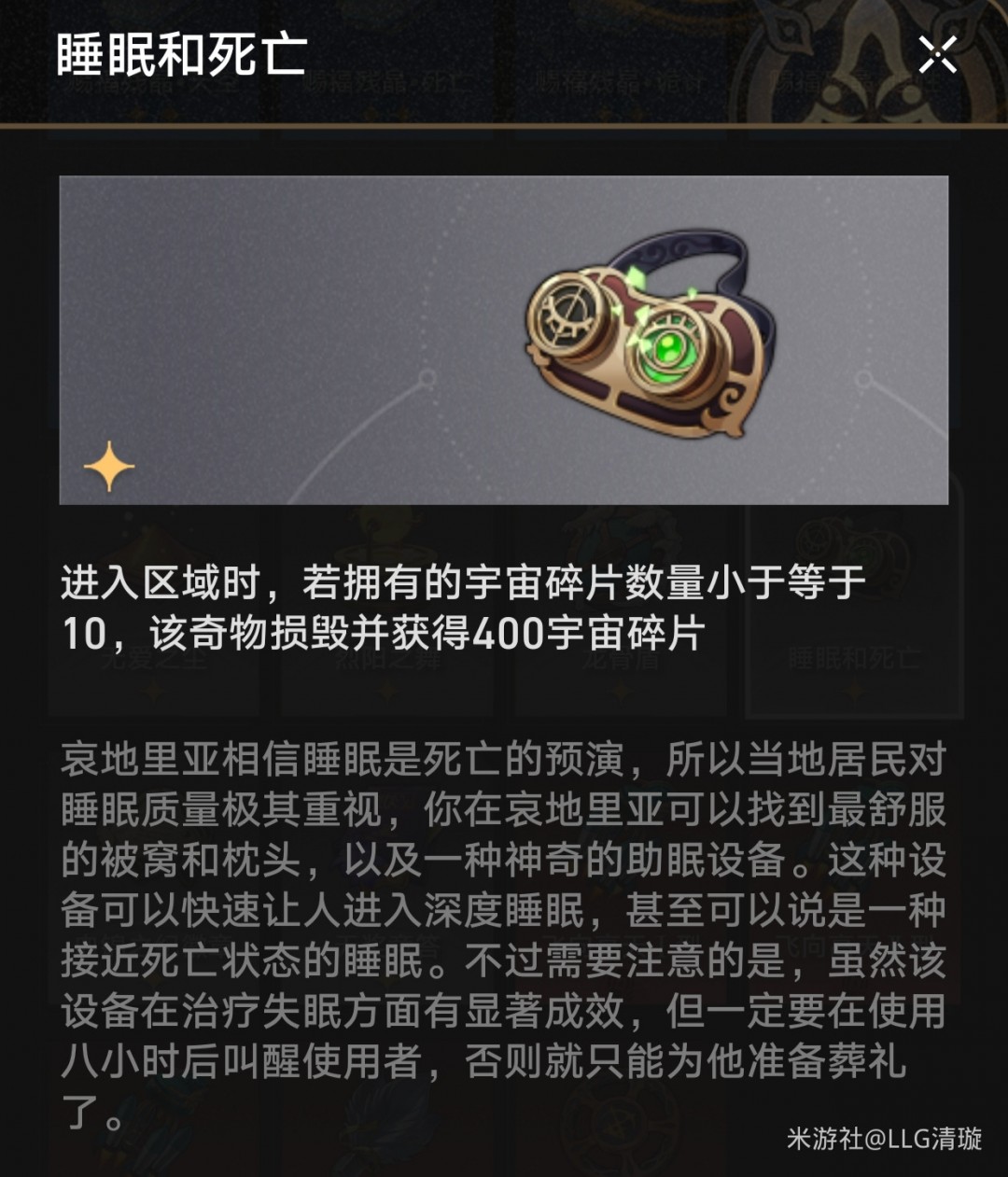 崩坏星穹铁道上线了3.3版本对于差分宇宙也进行了更新,在这个版本也更新了许许多多的新奇物,选择后还有不少效果,有不少小伙伴好奇睡眠和死亡奇物效果是什么,那么下面就来告诉大家。 崩坏星穹铁道睡眠和死亡奇物效果一览 可以拿 齿轮爆炸了,快选!—眼镜 齿轮爆炸完就到这位发挥的时候了 本文内容来源于互联网,如有侵权请联系删除。