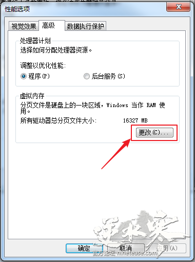 4、 在性能选项窗口中,切换到【高级】选项卡,单击打开【虚拟内存】部分的【更改】。