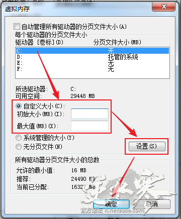 6、 然后选择想要分配虚拟内存的盘符,然后选择自定义大小,推荐设置虚拟内存大小是您机器物理内存的1.5倍到2倍。比如您的机器的物理内存是8G(8192MB),虚拟内存最大值推荐设置到12288MB~16384MB。您也可以根据机器实际情况进行调整。然后点击设置,最后点击确定。