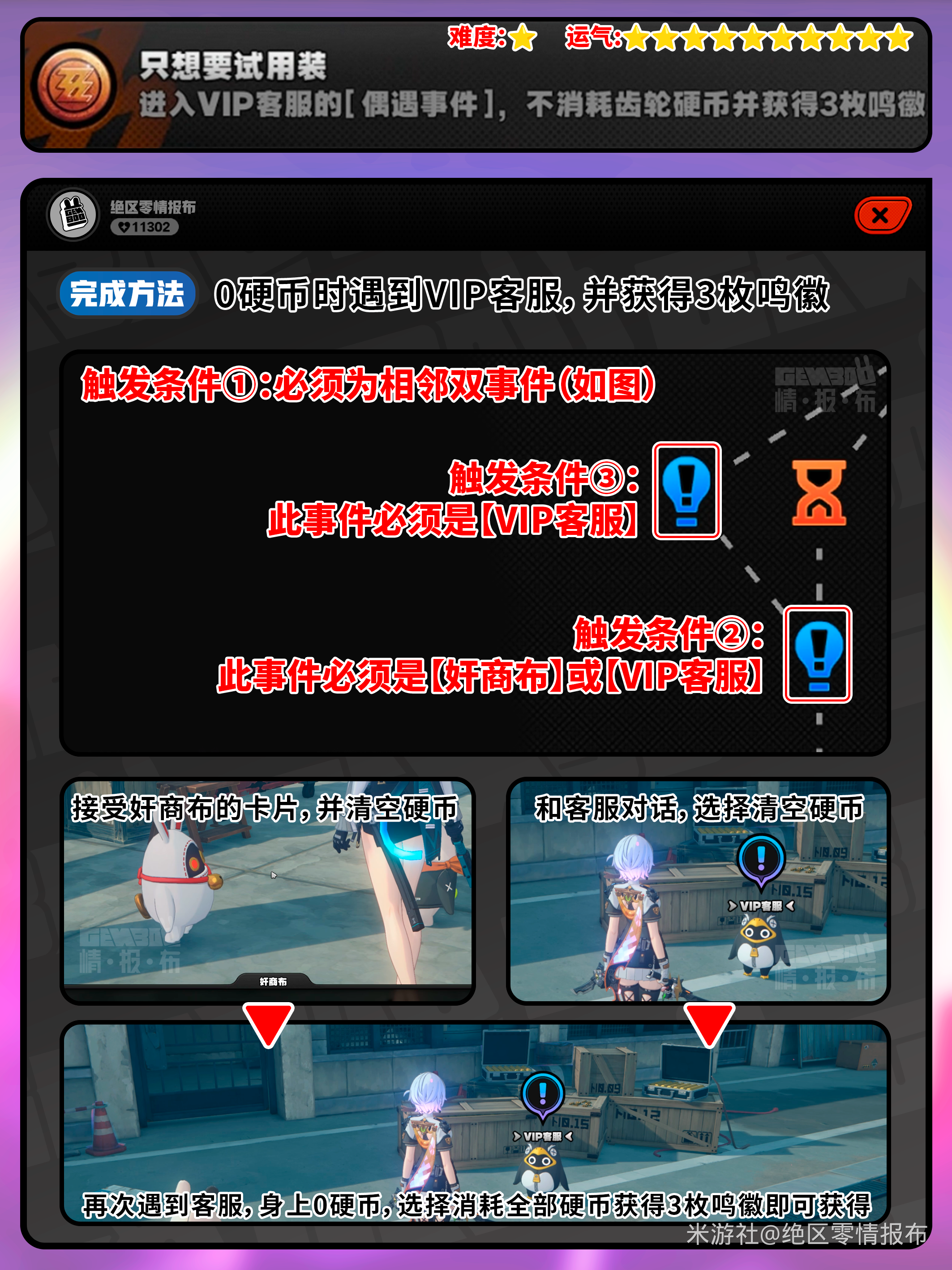 就在最近绝区零更新1.6了版本的更新上线,本次版本上线了许多新内容,新地图,新角色,新活动等,在新的地图还有新的成就,那么有小伙伴好奇没有衰仔成就怎么做,下面就来告诉大家。 绝区零只想要试用装成就攻略 完成方法 0硬币时遇到VIP客服,并获得3枚鸣徽 本文内容来源于互联网,如有侵权请联系删除。