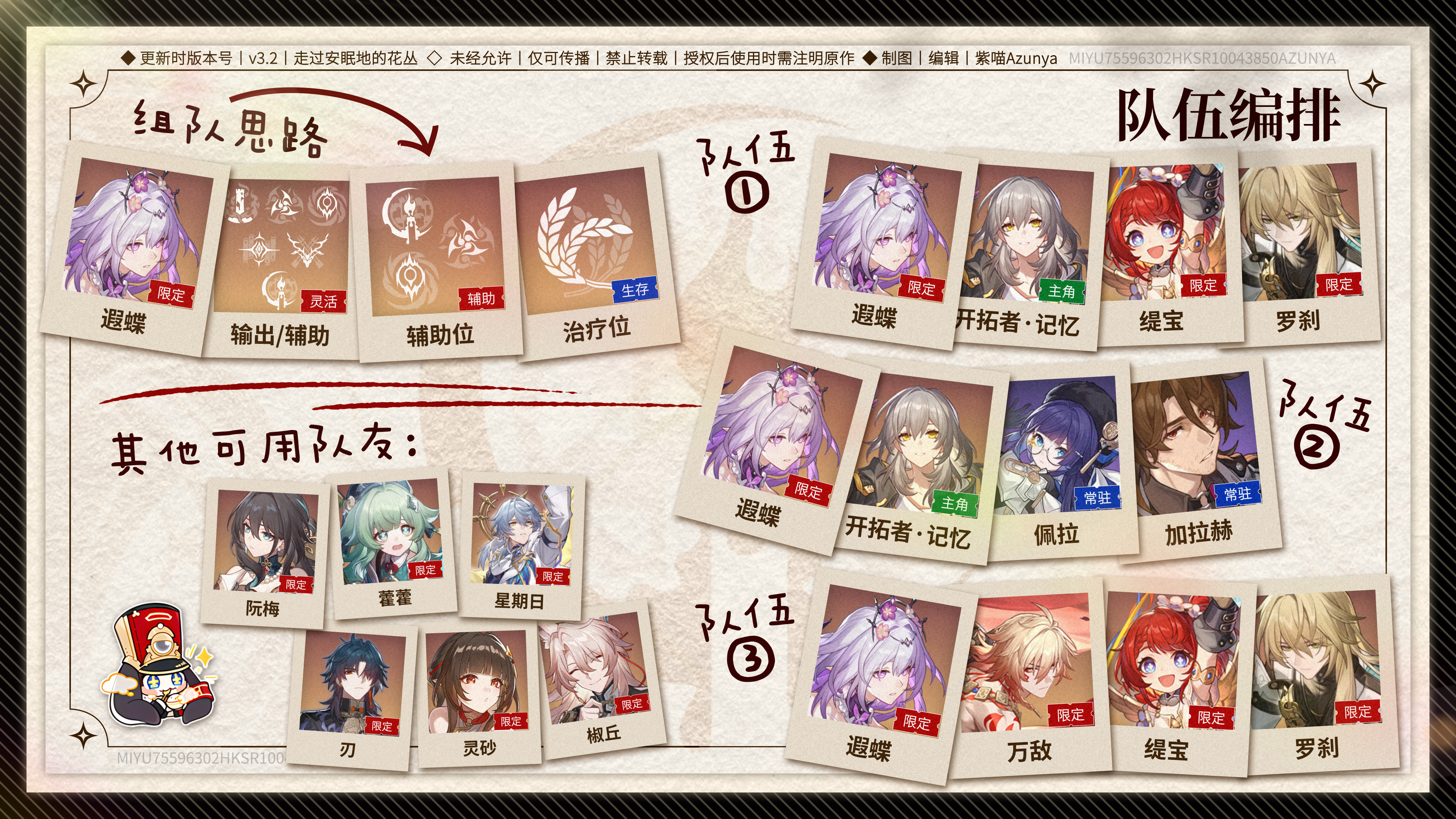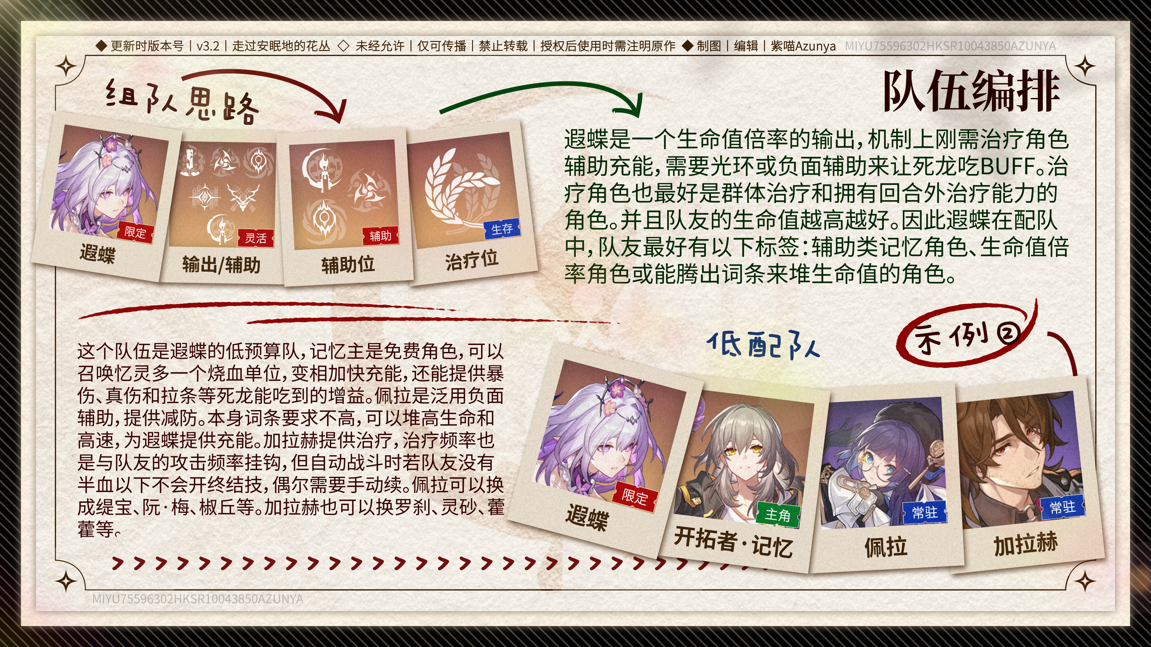 这个队伍是当前版本的遐蝶主流队伍,记忆主可以召唤忆灵多一个烧血单位,变相加快充能,也能提供多种死龙能吃到的增益。缇宝是光环辅,且提供的乘区比较稀有,本身也是生命倍率的副C可以堆高生命,多次追击的能力也可以配合治疗角色提高治疗频次。罗刹是群体治疗,有回合外治疗能力,本身虽然是攻击倍率但需要的攻击力也不会太高,大约三千攻击即可,堆生命也能堆个四五千。缇宝下位可换阮·梅、佩拉等,罗刹可换加拉赫、灵砂、藿藿等。愿意手动操作不走自爆流的话记忆主也可以换星期日。