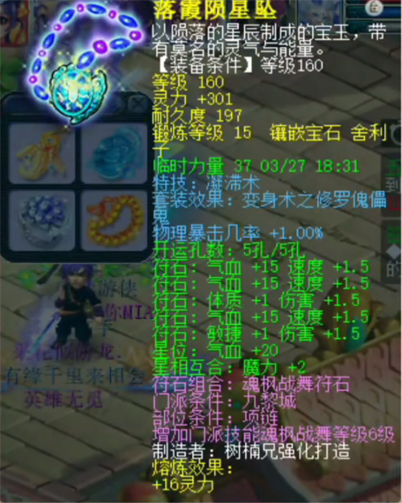 综合灵力317,附带1.00%物爆几率,附加特技凝滞术的160级项链。