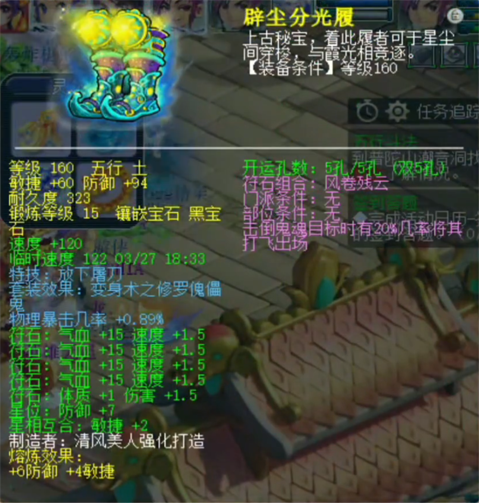 基础防御100,基础敏捷64,附带0.89%物爆几率特性,附加特技放下屠刀的160级鞋子。