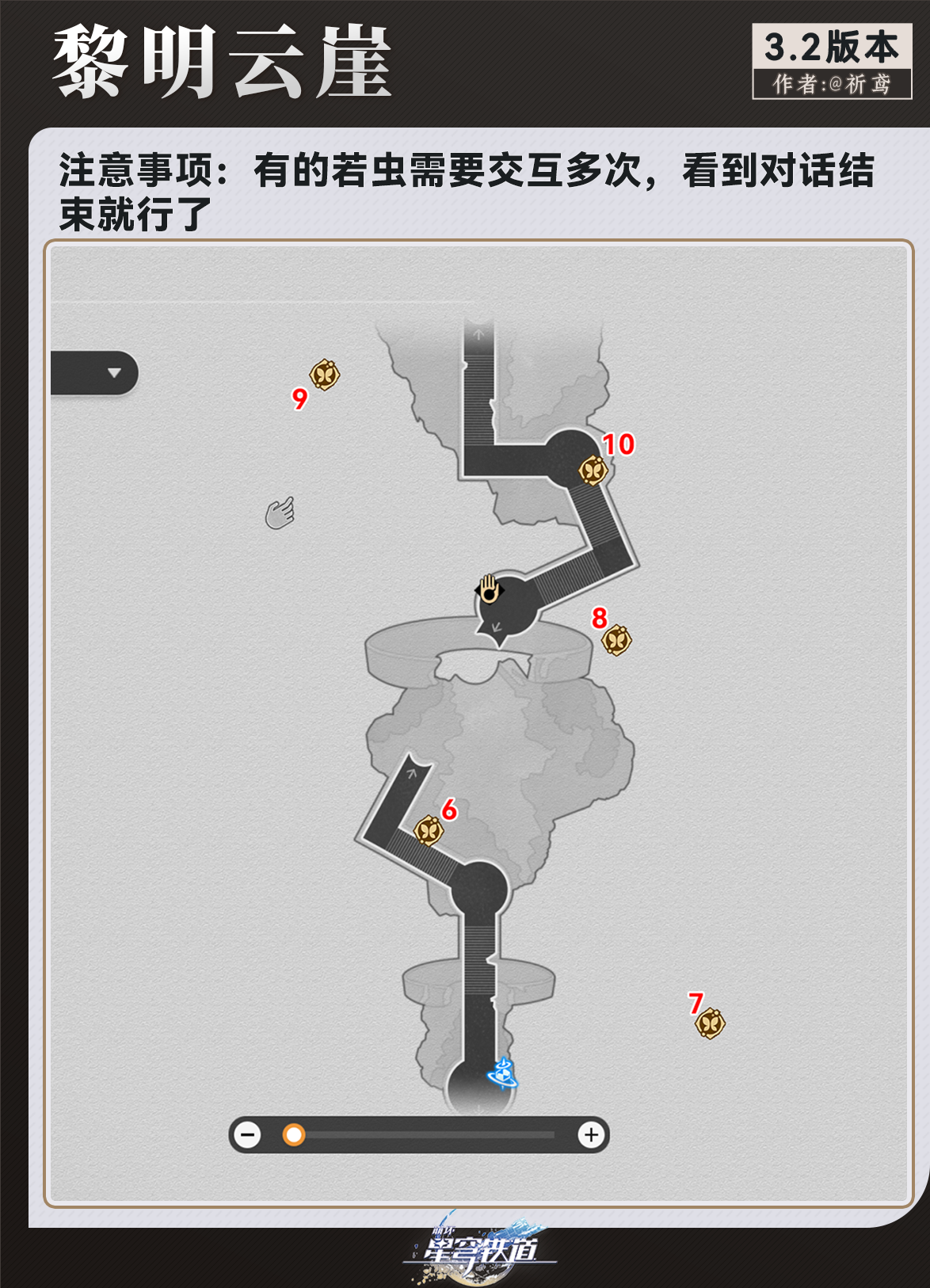就在最近崩坏星穹铁道终于上线了3.2版本给我们带来新冒险,这次版本更新还上线了许多新内容,有新遗器,新地图,新角色,还有新地图宝箱,那么有小伙伴好奇半神议院黎明云崖若虫在哪,下面就来告诉大家。 崩坏星穹铁道半神议院黎明云崖若虫收集攻略 注意事项: (1)共10只,有的若虫需要交互多次,看到对话结束就行了 若虫点位一览 若虫实机点位 本文内容来源于互联网,如有侵权请联系删除。