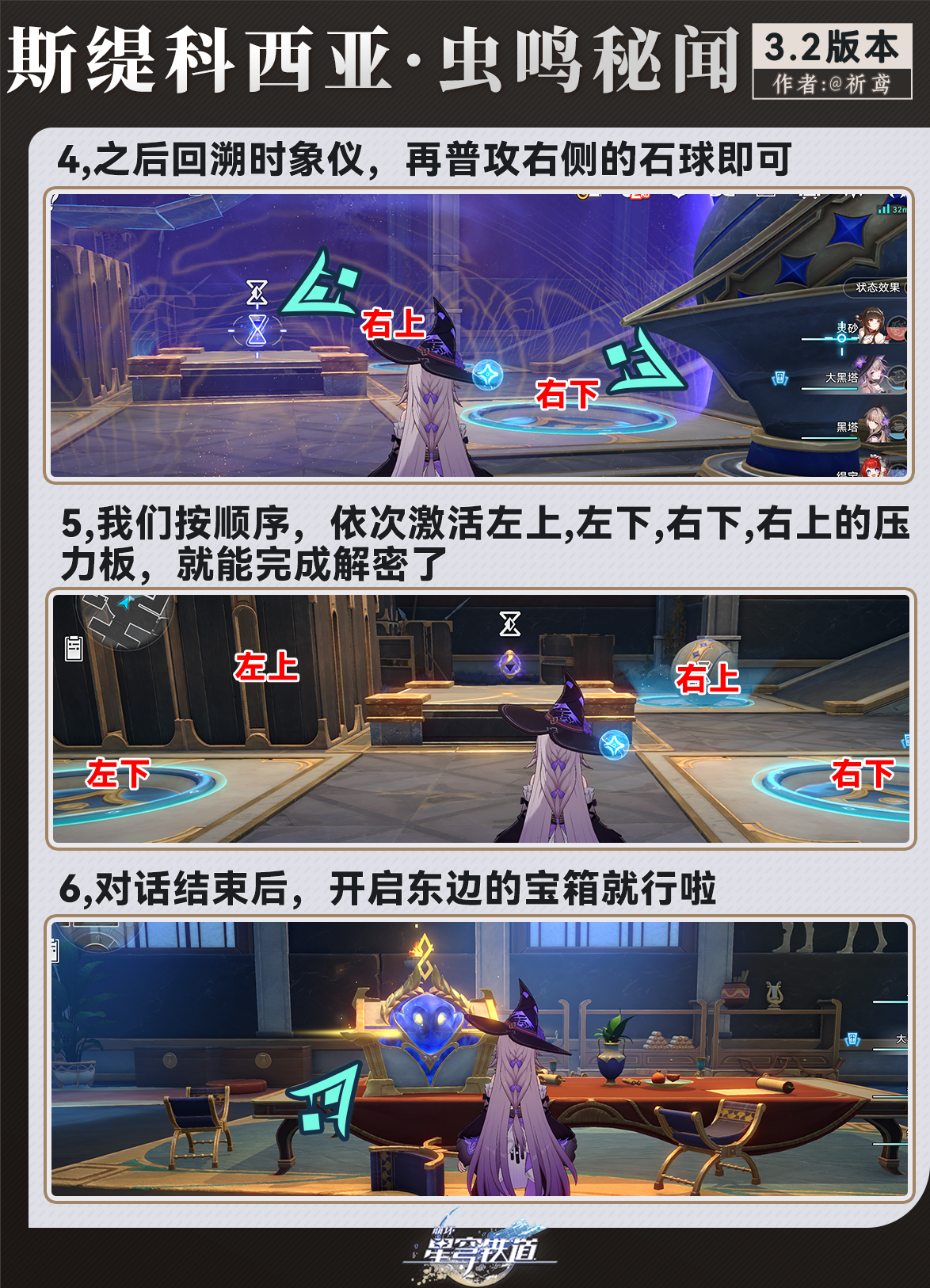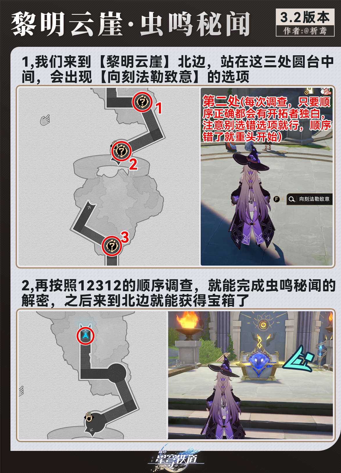 就在最近崩坏星穹铁道终于上线了3.2版本给我们带来新冒险,这次版本更新还上线了许多新内容,有新遗器,新地图,新角色,还有新地图宝箱,那么有小伙伴好奇3.2虫鸣秘闻怎么解密,下面就来告诉大家。 崩坏星穹铁道3.2虫鸣秘闻解密攻略 注意事项: (1)解密正常是要收集若虫获得提示,不过看攻略直接逃课就行,我就跳过解密步骤了 (2)完成解密共可以获得2个珍贵宝箱,以及2个成就(虫鸣秘闻系列成就) 本文内容来源于互联网,如有侵权请联系删除。
