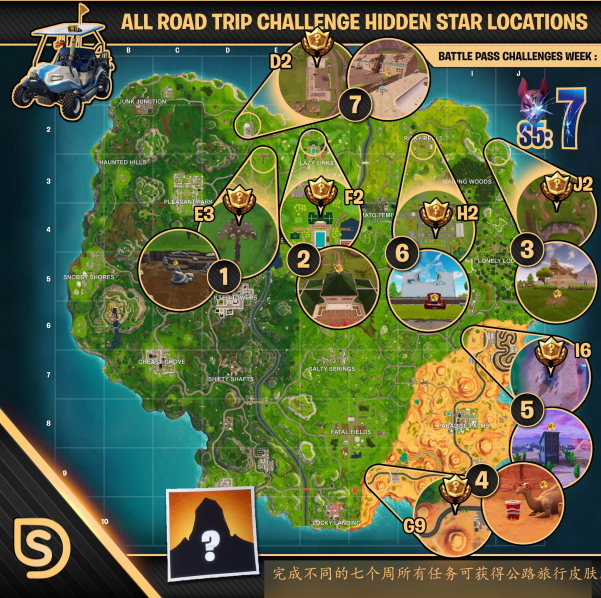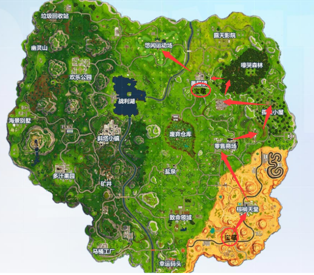 搜索宝箱位置:海景别墅,战利湖,致命领域,马桶工厂,垃圾回收站,孤独小屋,盐泉,棕榈天堂,多汁果园,欢乐公园,矿井,零售商场,幸运码头,嚎哭深林,幽灵山。