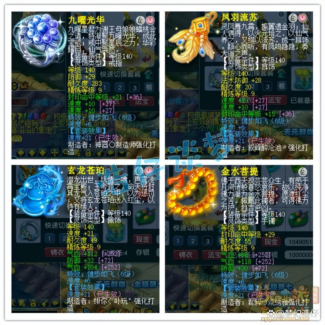 戒指和耳饰下排都是双速度一封印,佩饰和手镯下排都是双气血一防御,全部打了9锻星辉石,特效6级健步如飞!