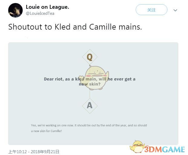"是的,我们正在努力为他们制作新皮肤。克烈的新皮肤,应该能够在今年年底的时候上线,至于卡蜜尔的话,她也会获得一个新皮肤。"