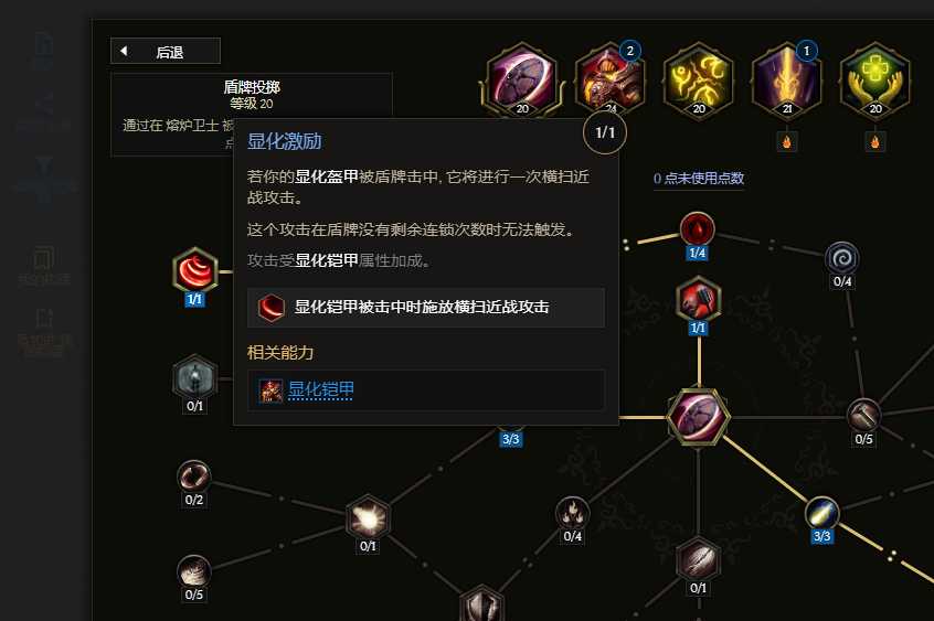 核心输出技能,显化盔甲,特殊的召唤物,正常的召唤物只吃召唤物的加成,和人物本体的伤害加成属性无关,但是显化盔甲通过技能节点享受人物武器的属性加成和手套、靴子、头盔、胸甲的加成。显化盔甲的基础属性先天自带20%less,攻速较慢,可以通过盾牌投掷的显化激励节点,借助高频盾牌投掷击中显化盔甲,单个boss战达成单次投掷盾牌触发两次显化盔甲这个横扫攻击的攻击模式。投掷攻速比较好堆,可大幅增加显化盔甲的攻击频率,从而提高伤害。