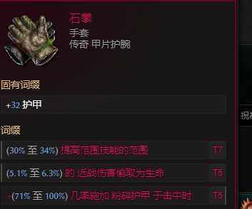 手套:石拳,世界掉落。眩晕词缀优先高roll 合成词缀如下 优先保证范围词缀,其他的都能在别的地方找,晕boss很香,负面作用对小宝无效。