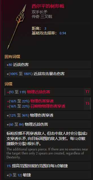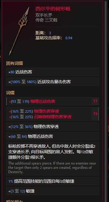 武器:西尔平的树形戟,大量近战点伤和暴击伤害,还有物理伤害穿透,提升输出很大。 流亡法师专属掉落 合成词缀优先近战物理伤害 其次 物理伤害穿透