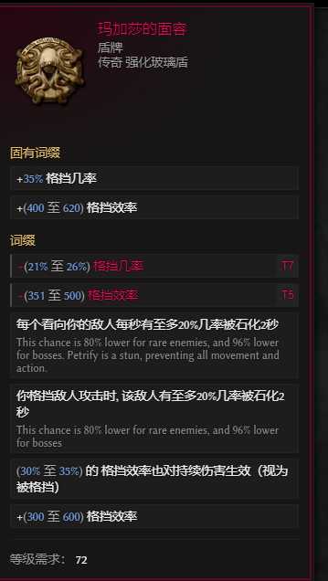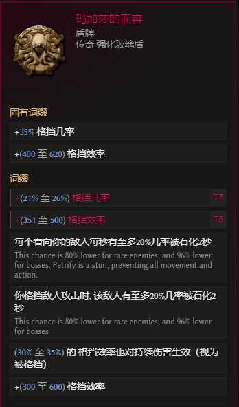 盾牌:玛加莎的面容。神躯墓穴 编织秘境专属掉落 合成词缀优先高格挡几率。格挡转持续减伤 尽量高roll