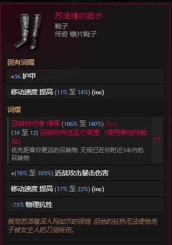 靴子:苏洛隆的脚步 世界掉落 合成个召唤伤害即可 提供大量 近战暴击伤害,该属性roll越高越好,其次移动速度词缀