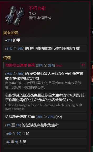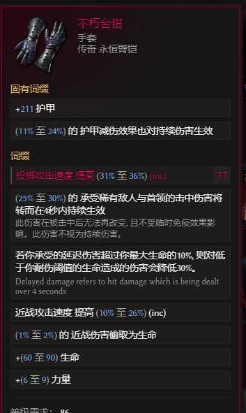 手套:不朽台钳最好 超级阿波罗专属掉落 合成词缀优先投掷速度。没有永恒紫装手也行