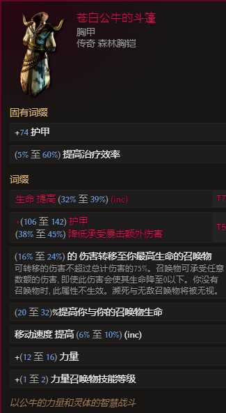 胸甲:苍白公牛的斗篷 世界掉落。属性完美 高减伤 合成词缀优先生命%
