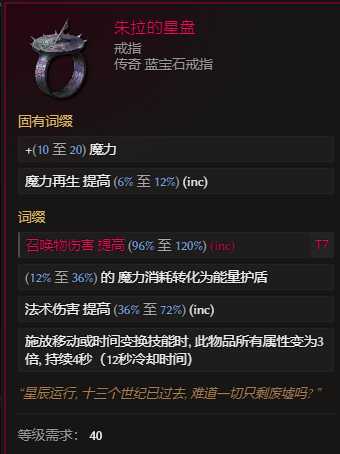 朱拉戒指 时空圣殿1难度必出,必有1孔,合成词缀召唤伤害 位移触发buff然后召唤提供最多360%召唤伤害 提升巨大 也是个快照