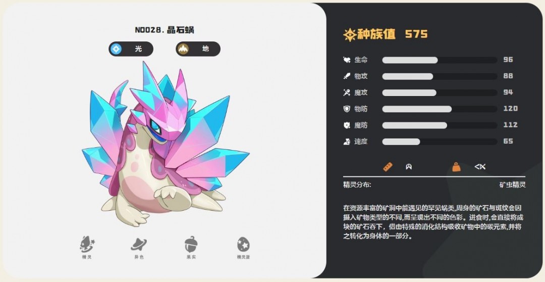 在资源丰富的矿洞中能遇见的罕见蜗类,周身的矿石与斑纹会因摄入矿物类型的不同,而呈现出不同的色彩。进食时,会直接将成块的矿石吞下,借由特殊的消化结构吸收矿物中的碳元素,并将之转化为身体的一部分。