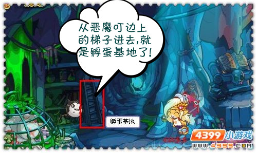 大家要先来到【暗黑魔法学院】,从恶魔叮旁边的梯子,可以进入孵蛋基地,非常地隐秘,请看图~