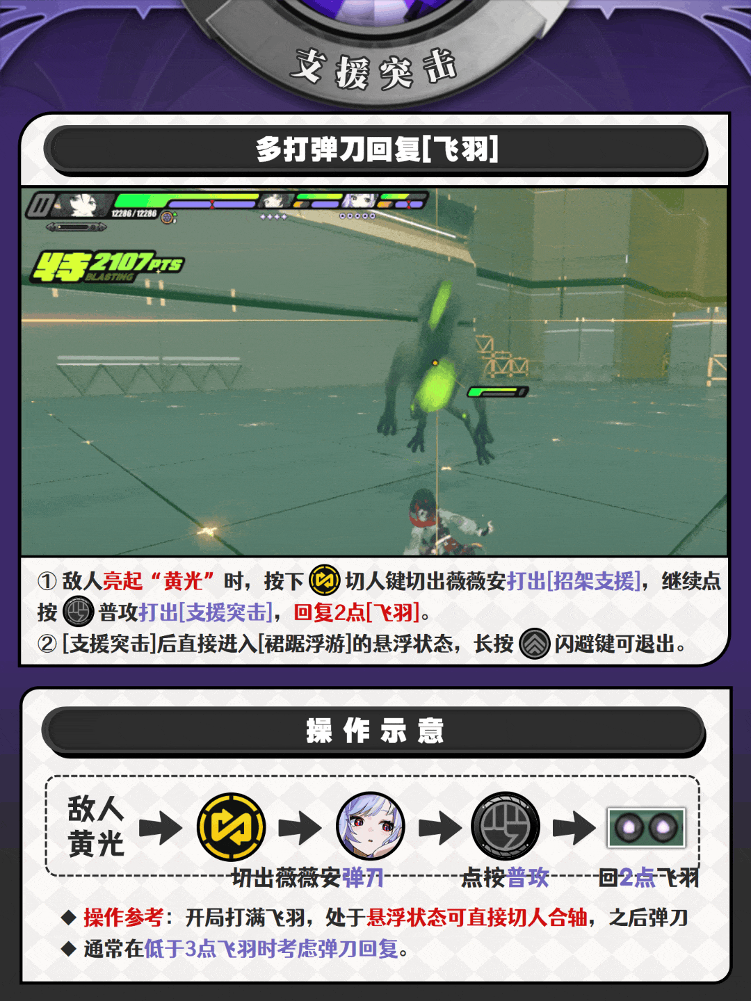② 薇薇安【护羽】低于3点时可在敌人亮起黄光切出打弹刀(招架)。