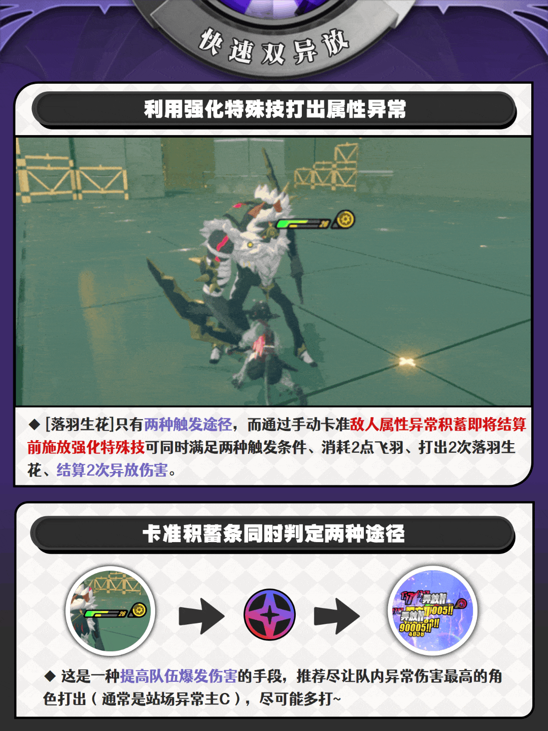*每次消耗护羽可打出落羽生花,命中异常敌人可造成异放伤害。