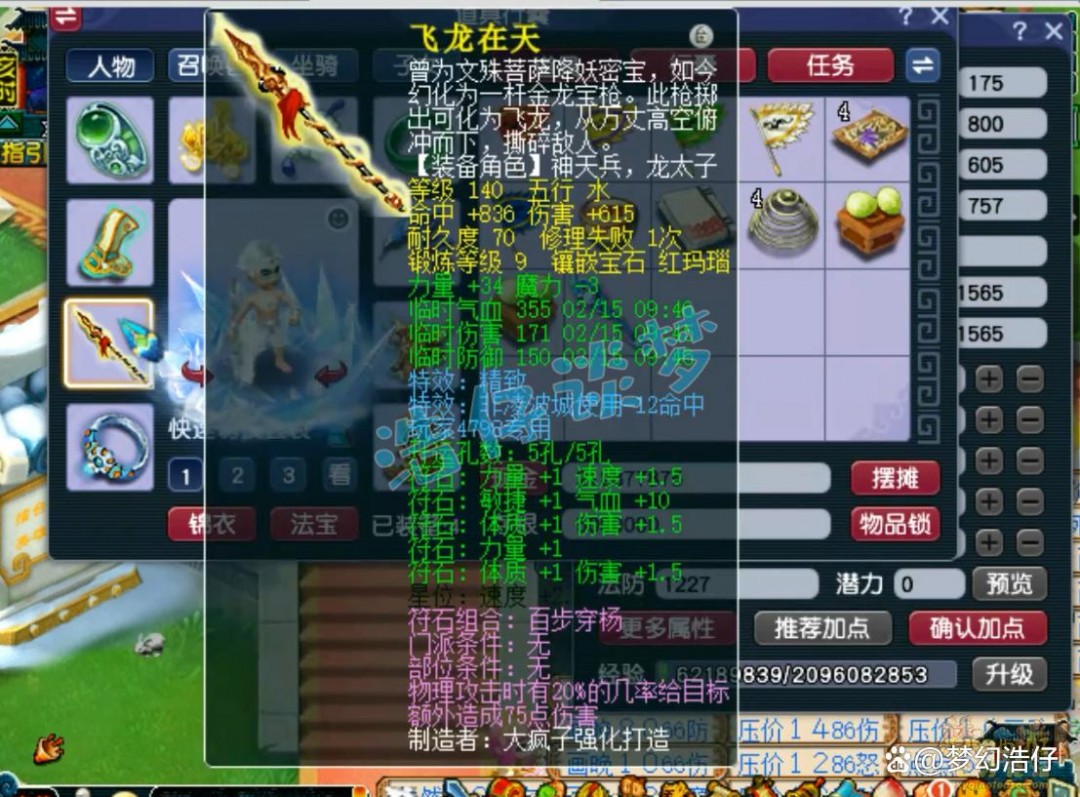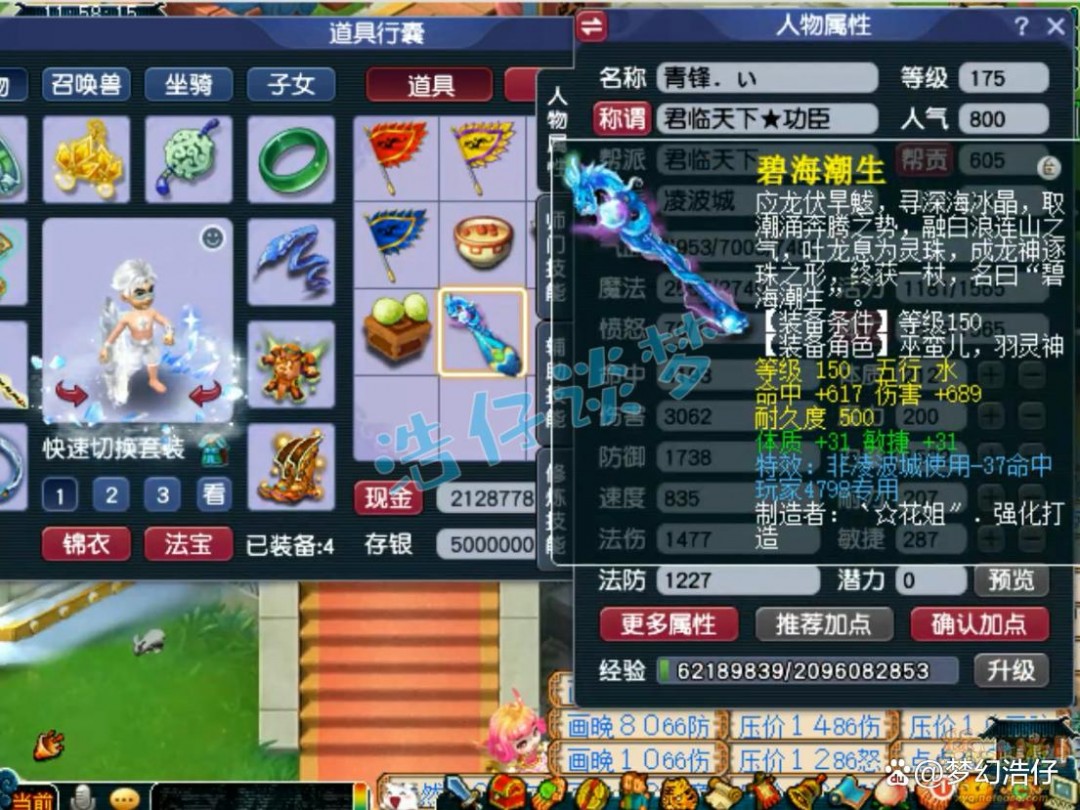 175级凌波城打符之后的面板属性,3062的伤害刷任务完全足够了,而且凌波城面板伤害并不是太重要,主要靠战意打伤害!