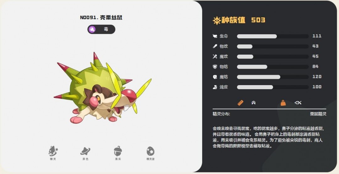 会嗅来嗅去寻找花蜜,吃的花蜜越多,鼻子分泌的粘液越香甜,并且带着花香的味道。 会用鼻子把身上的毒刺都涂满香甜粘液,用来吸引并捕食虫系精灵。为了避免被尖锐的毒刺,商人会做带绳的爬爬模型去蘸取粘液。