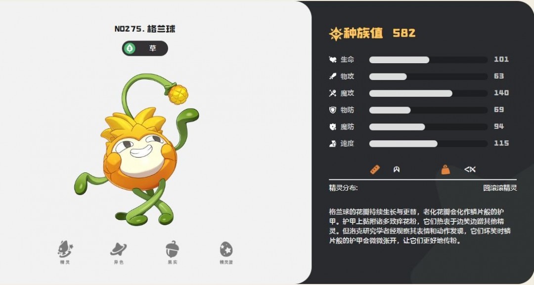 格兰球的花瓣持续生长与更替,老化花瓣会化作鳞片般的护甲。护甲上黏附诸多致痒花粉,它们热衷于边笑边蹭其他精灵。但洛克研究学者经观察其表情和动作发现,它们坏笑时鳞片般的护甲会微微张开,让它们更好地传粉。