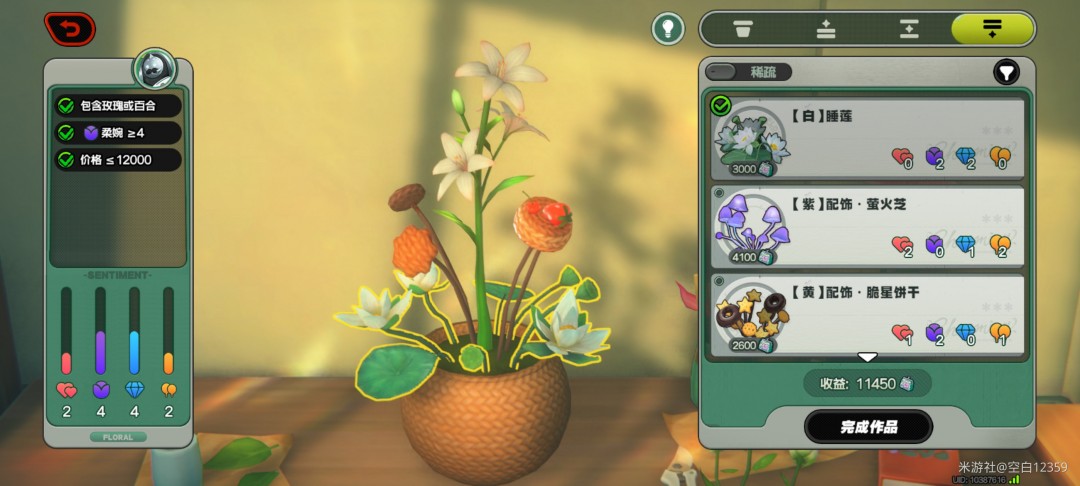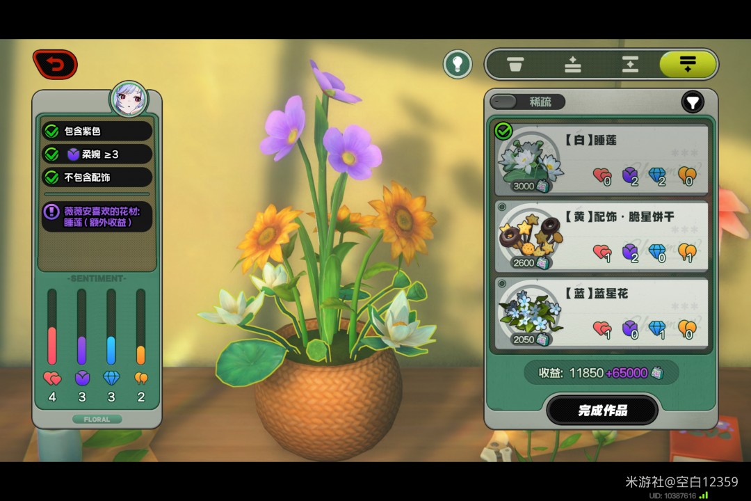 任意花盆,【紫】紫花地丁,【黄】向日葵,【白】睡莲