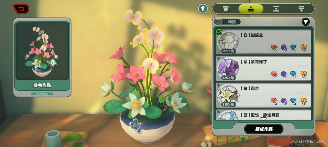青花花盆,【白】蝴蝶兰,【粉】桔梗(稠密),【白】睡莲(稠密)