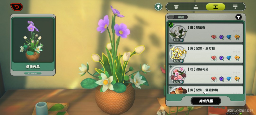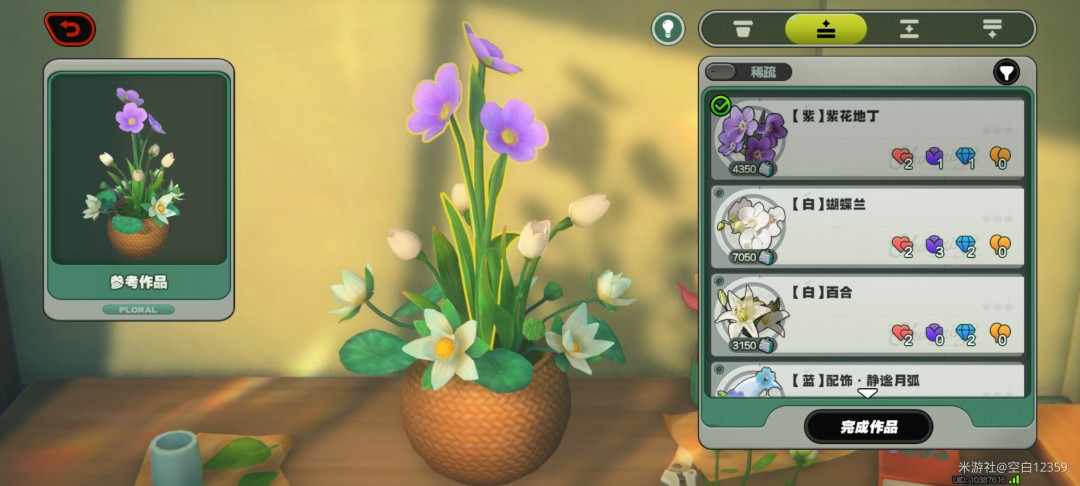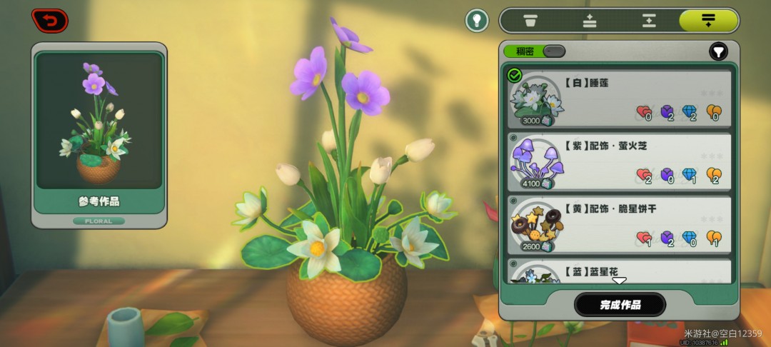 木质盆栽,【紫】紫花地丁,【白】郁金香,【白】睡莲(稠密)
