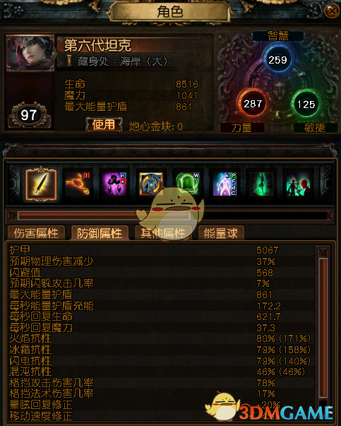 8500血78%攻击格挡,3元素抗性上限 80,79,79 召唤伤害 552%