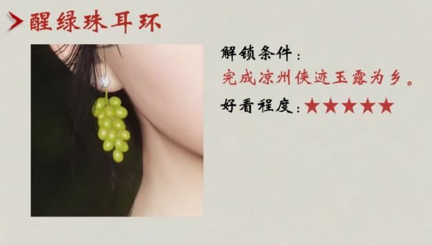 燕云十六声是一款开放世界游戏,就在最近上线了凉州地图,在凉州也有不少可以白嫖的漂亮服饰,那么有不少小伙伴好奇醒绿珠耳环怎么获得,下面就来告诉大家醒绿珠耳环获取攻略。 燕云十六声醒绿珠耳环怎么获得 解锁条件 完成凉州侠迹玉露为乡 本文内容来源于互联网,如有侵权请联系删除。