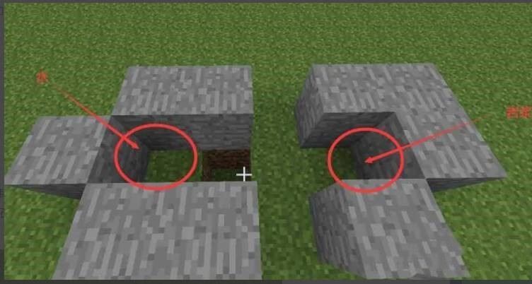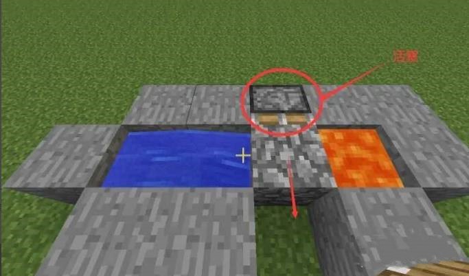 1、按照图中方法放置方块,然后分别放入水和岩浆,这样一台半自动的刷石机就完成了。然后在其中一个缺口放入活塞,推进位置对准石料生成方向。