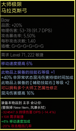 再退一步,杖做出了完美的+3杖+75%混沌持续额外,弓和长杖这35%的额外混沌持续加成和110ES的选择,转换成数据就是32万持续伤害对500点最大ES。